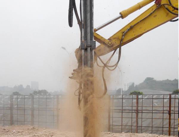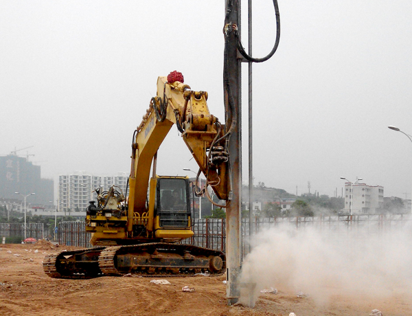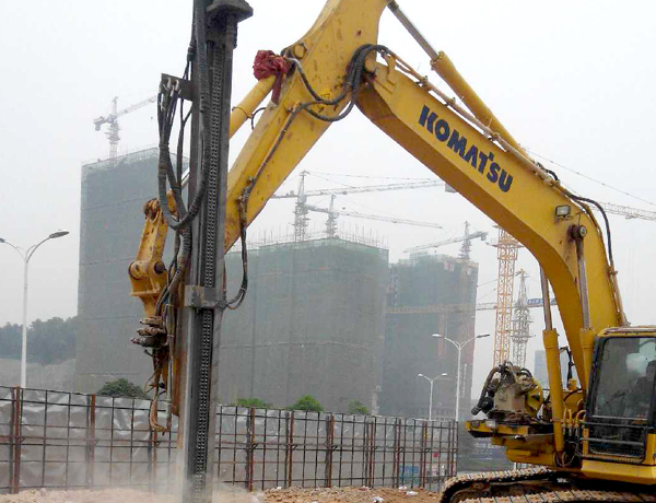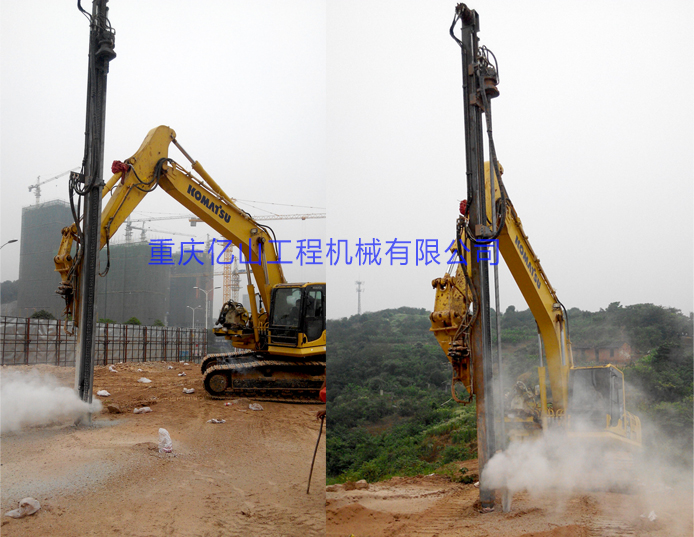 2、前后左右自由伸展,當(dāng)挖掘機(jī)在工地不平坦的情況下, 挖機(jī)手可根據(jù)位置不同調(diào)整鉆桿角度,保持90°垂直鉆孔。