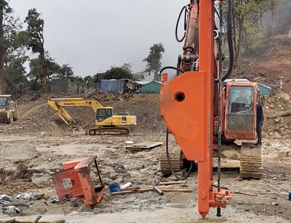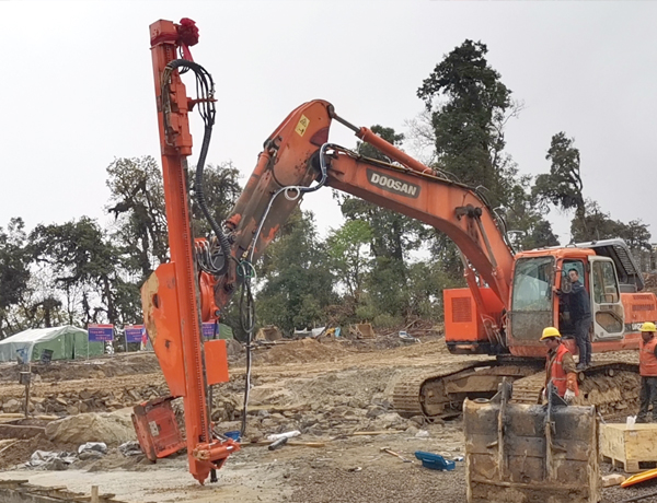 2、前后左右自由伸展,當(dāng)挖掘機(jī)在工地不平坦的情況下, 挖機(jī)手可根據(jù)位置不同調(diào)整鉆桿角度,保持90°垂直鉆孔。