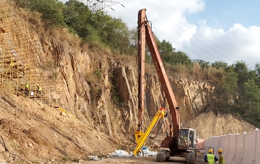 3、作業半徑擴大化 。因為挖掘機小臂不拆,它的作業半徑可以延長作業半徑2-3米,且仰角打孔、水平打孔、豎直打孔都可以實現。